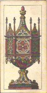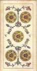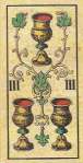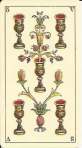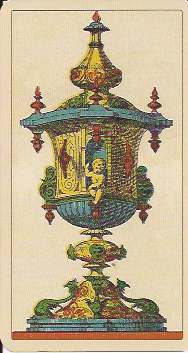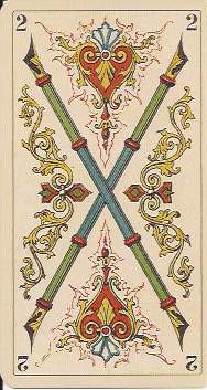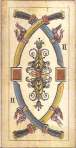 The Avondo Brothers gave the pip cards some unique features. The Ace of Cups is unlike that of any other deck. A cherub sits in a window cut in the side of a large chalice that has dolphins at the base. The cups in the rest of the suit have blue jewels on their bowls. The suit of Batons is decorated with gold plaques, red hearts and filigrees instead of the usual flowers and leaves. The center enclosure in the even numbered swords cards has an oak or laurel branch instead of a flower as in most decks. The Ace of Coins has the tax stamp and Winged Mercury in the center of the coin. The vegetation throughout the pip cards is heavier and more lavish than in any other deck.