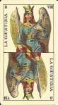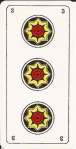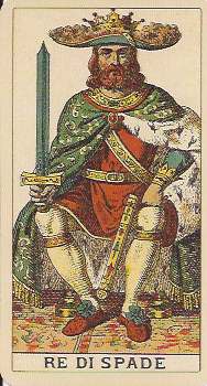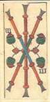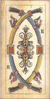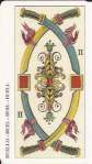 The Trumps are nearly identical to the Dellarocca/Gumppenberg deck except for having Arabic numbers in the corners as well as roman numerals top center. The Emperor and most kings have beards and longer hair than in Dellarocca’s designs, giving them a more mature appearance. The lines are less refined and the images are more robust.