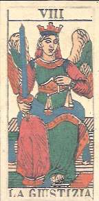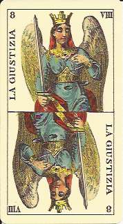 In the mid-1800s, Dellarocca’s design innovations were adopted by numerous printers such as Dotti, Milese, Lamperti, and Negri. Some printers created a hybrid of the Tarot de Marseilles and Dellarocca, while others just used a few details from Dellarocca. The most popular design elements incorporated into these decks were Justice’s tilted body, the Bagatto’s wine cup, and the dancing couple on the Sun card. These hybrid decks have not been reproduced but can be seen in Stuart Kaplan’s Encyclopedia of Tarot Volume II, pages 360 to 368.