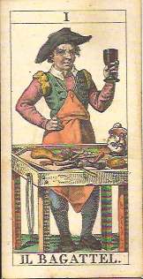 - The Bagatto is a cobbler standing in front of a work table strewn with the tools of his trade. There’s a jug on the table and the cobbler hoists a large glass of wine.