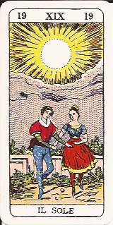 - On the Sun card, a carefree young couple dances in a walled garden under a bright sun that is burning away the last of the clouds.
