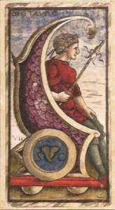The court cards are numbered 11, 12, 13 and 14 and are named for historic and mythic characters. All the Queens are mentioned in Bocaccio’s 1362 book De Claris Mulieribus (On Illustrious Women). The pip cards are fully illustrated and have little Arabic numbers tucked among the illustrations. Pamela Colman Smith saw photographs of the cards at the British Museum and modeled several Waite Smith cards on them.