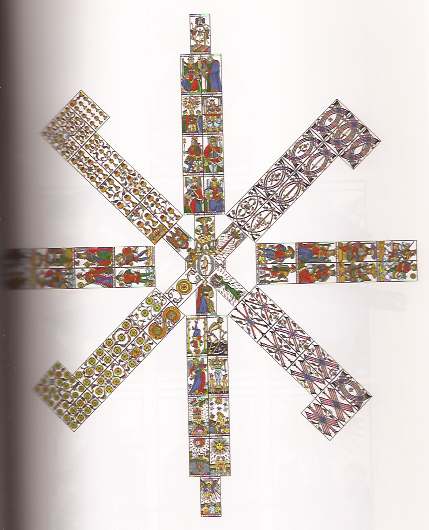 I counted at least forty spreads and techniques in the 90-page section on reading tarot. Each spread is illustrated with diagrams, photos and sample readings. The student progresses from one-card readings to a 22-card spread, although most of the spreads are for one to three cards. Jodorowsky also presents creative techniques like using a card as an ally, doing a reading for a trump card to better understand it, and rearranging cards within a spread. True to his European background, Jodorowsky uses only trumps in his readings.