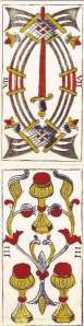 The cards illustrated above are from the Pierre Madenie deck printed in Dijon in 1709; the earliest example we have of the standard Tarot de Marseilles (what’s called the TdM II style). Yves Reynaud of Marseilles makes beautiful facsimile editions of this and other historic decks. You can see and purchase them at his website http://www.tarot-de-marseille-heritage.com/