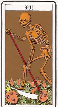 I was rather surprised to hear the “Death actually means transformation” line from a traditional French card reader. I’ve always associated that optimistic interpretation of Death with psychologically-oriented Americans. I checked three French authors and found the following interpretations of the Death card: