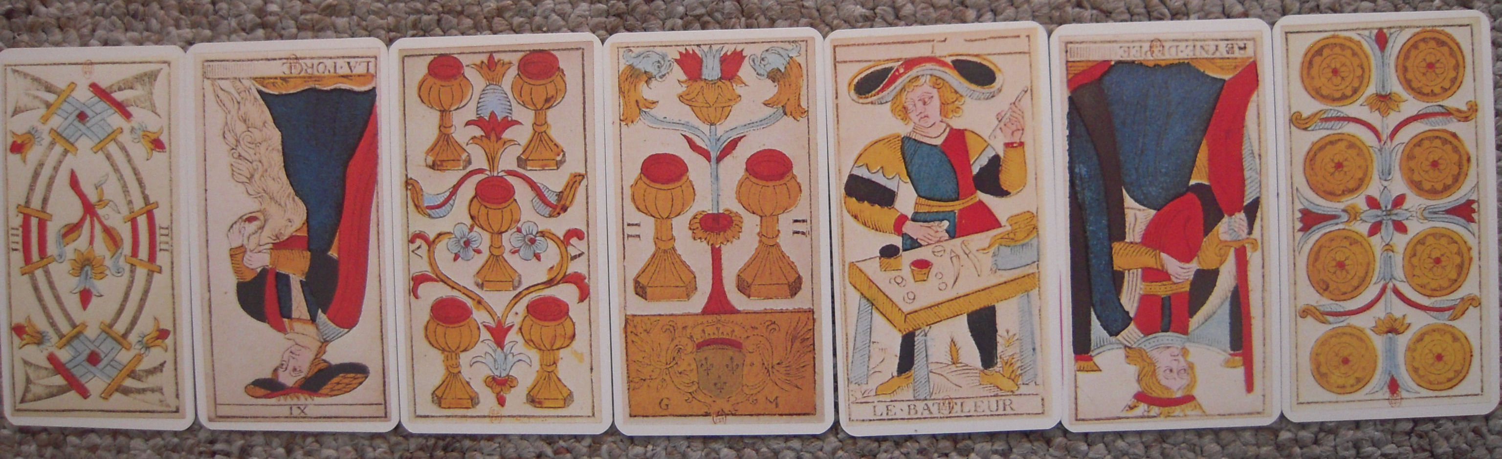 The other day, I read the booklet that comes with the Tarot de Marseille published in France by Heron hoping to find some traditional card interpretations. Instead, I found myself in a topsy-turvy world where the Star card means death, the Death card indicates marriage, and Temperance can predict disasters of a sexual or marital nature. (Temperance with the Ace of Batons means an illegitimate child, and reversed Temperance means a man will kidnap a married woman.)