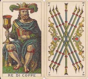 Yesterday morning, before pulling my two cards for the day, I asked myself how I wanted to feel during the day. I have several writing projects stacked up, so I wanted to feel focused and productive. I asked the cards what I could do to make it a productive day, and pulled the King of Cups and the Seven of Batons from the Ancient Italian deck.