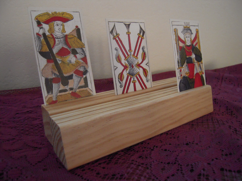 In the top photo, the Ancient Italian spread on the left sits on a flat board set at an angle with four grooves to hold cards. The Pierre Madenié cross spread is set up using two card holders with three grooves each.