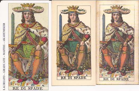 King of Swords from three soprafino decksThe colors are rich and deep – sometimes so dark they obscure the details. Ink, especially the red, slops over the lines. You don’t see this in the other two decks, but it’s not nearly as bad as many stenciled decks. The intense sapphire blue is unique to this deck. It’s found on the Fool’s pants, the Star card’s water, and the sword blades of the ace and court cards of the swords suit. A few cards have minor cropping: The Fool card lost part of the dog’s front leg and the Fool’s bag. The background is cream with no staining. The publisher either worked from a pristine copy or cleaned the cards up.