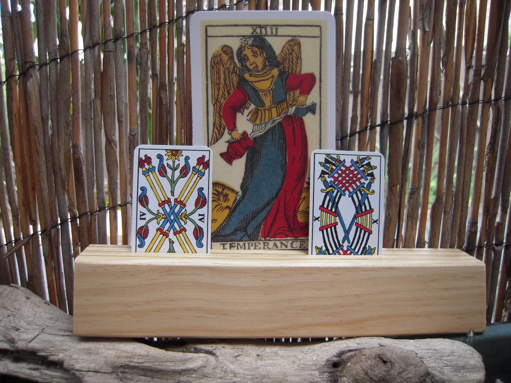 Conver in holderI often do three-card readings with just the suit cards then take their sum to get a trump card as the theme of the reading (see this article on reading trump and suit card combinations). With two deck sizes the trump card from this oversize deck can loom over the smaller cards like a guardian. I used my smallest deck in this illustration, a Claude Burdel TdM published by Lo Scarabeo. See this article for putting layouts in card holders.