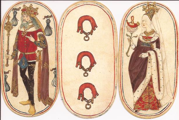 This deck was included in the exhibit of medieval playing cards at the Cloisters in early 2016. The catalog for this exhibit, The World in Play, has the same information as the booklet accompanying this deck, as well as large color versions of the tiny, black and white illustrations in the booklet. Guinevere’s Games used to sell this deck, along with two other hand-painted decks from about the same time period; but this deck has been removed from their website. All three decks were printed by Piatnik in the 1970s, so it seems this is a Piatnik reprint.