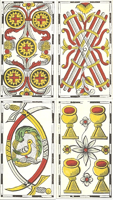 This Brussels-Rouen pattern deck is first cousin to the Tarot de Marseille. Some of its unique imagery may stem from a lost tradition that migrated from Ferrara to France and Belgium. Its most notable feature is the substitution of the Spanish Captain and Bacchus for the Papesse and Pope. Read a lot more information about this deck and the Captain in another blog article here.