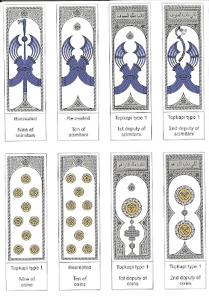 Many thanks, Sherryl, for your friendly review of my deck. There is just one little thing I would like to clarify. When L. A. Mayer suggested that the Topkapi deck had four court cards, he referred to the altered cards with the added blue patches plus extra type 2 and type 3 cards. He assumed that what we regard as kings in the deck actually came from two different court cards. This was due to some subtle differences in the grammar used in the court titles. Dummett has refuted this idea with some good arguments. My own idea about the number of court cards is about the original type 1 deck instead. It is based on the assumption that the distinction between pip cards and court cards would have been possible by looking at the designs only.