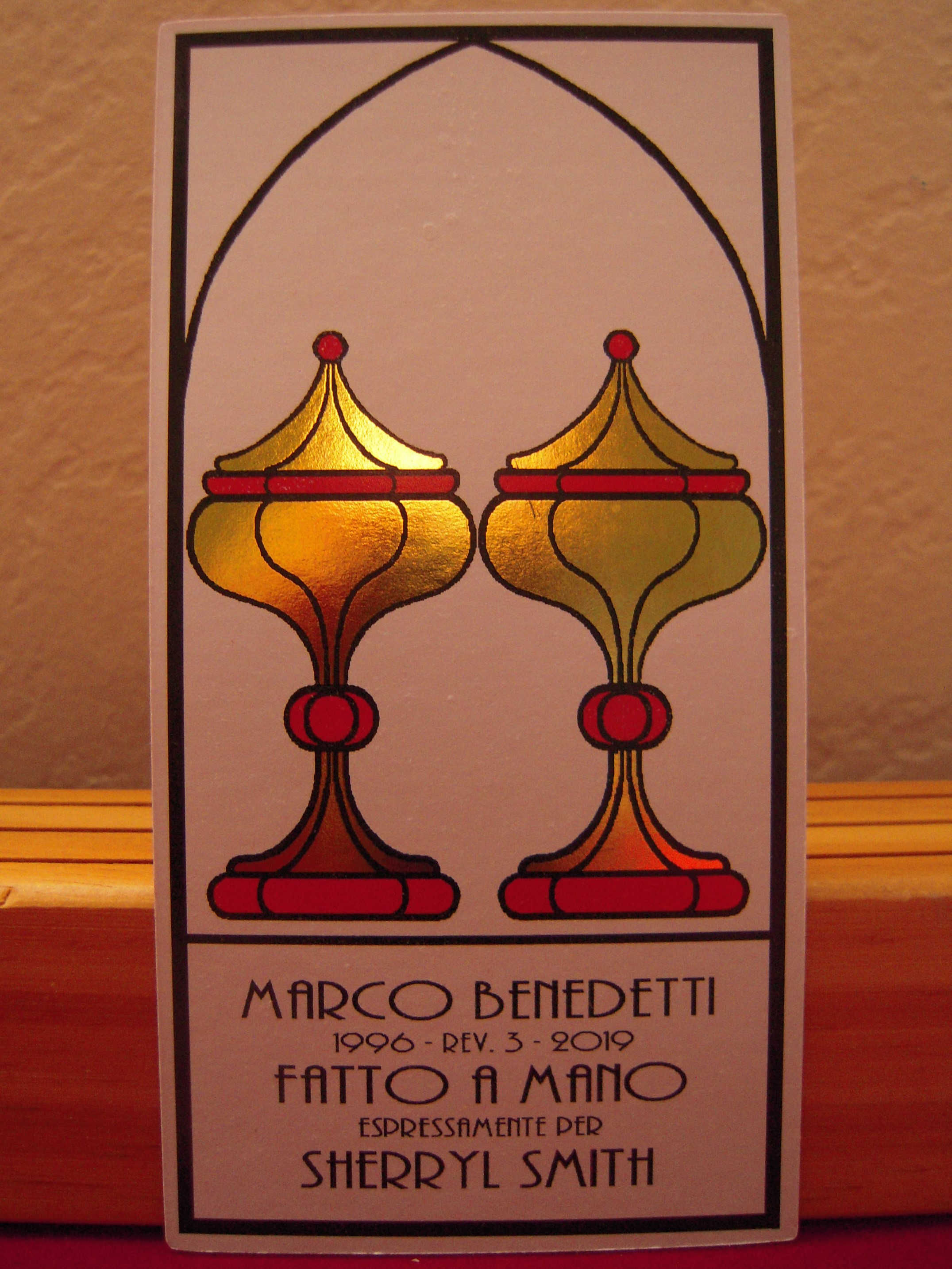 my California doorstep (amazingly, at the very moment of the Spring Equinox on a Wednesday afternoon). I was stunned to find myself the recipient of a magically beautiful gold and silver foil version of the deck, considerably larger than the Gamecrafter deck, printed on heavy card stock. And with my name on the title card, no less! It’s housed in a sturdy wood box lined with red paper, a card pasted on the cover and the spine printed in gold. This magical gift has now become the first deck I would save in an earthquake (with Sullivan Hisman’s Budapest and Rosenwald decks not far behind).