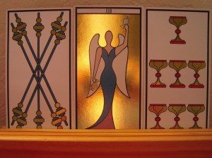 A friend organized a show of original tarot art in 1996 and invited Benedetti to participate. He created a 78-card deck the same size as the original using Bonifacio Bembo’s 15th-century technique of tempera paint over gold and silver leaf, painstakingly applied by hand to cardboard. He also created twenty-two over-sized trumps which he framed and entered into the 1996 exhibit. The Hermit shown here is an example of how genuine gold gives a heavenly glow to the cards. I’m rather amazed that Benedetti actually shuffles and reads with his one-of-a-kind gold deck. He applied the gold leaf to a red background, so if the gold wears off from shuffling, the red will show through just like it does in the worn V-S cards. But Benedetti had access to a paint fixative unknown to Bembo so the cards are holding up well with daily shuffling.