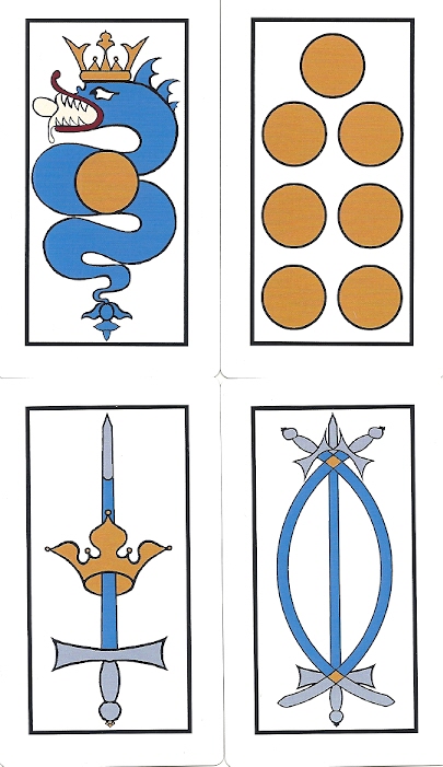symbols to the essential. I asked him why the swords look like TdM pips rather than being straight as in the original V-S deck. I only know European playing cards from studying historic decks, while he’s a native Italian who’s been playing cards since he was a child. In his world, swords with curved scimitars on playing cards seem normal, while straight swords seem peculiar. Then there’s the historic precedent of the Brambilla deck commissioned by the Duke of Milan @1442. Rather than being true to the V-S original, Benedetti went with the design that felt natural to an Italian card player.