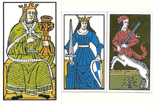 We have very little evidence for the tarot cards ordinary people played with in the 15th century. Only two decks from that century survive because they were never cut up into individual cards. The sheets of uncut cards were used as filler in book bindings preserved in archives, so they didn’t incur same fate as most playing cards – used up and tossed in the fire.