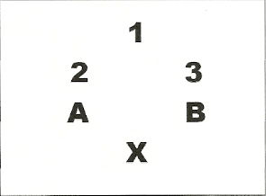 To prepare for the reading, shuffle the 22 trump cards separately. Choose a suit for the reading, pull those 14 cards out of the deck and shuffle them separately. (I use Cups for the reading below since it’s about a hoped-for relationship). In the layout shown below, cards 1, 2 and 3 are trump cards, and A and B are suit cards. X is a trump card derived from the sum of cards 1, 2 and 3.