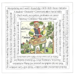 The keywords surrounding the picture will give you a range of meanings. For instance, the Juggler right-side-up is about knowledge, skill, dexterity, communication and career, among other things. Upside-down, these optimal qualities are distorted into workaholism, dislike of one’s career, using skills destructively, and blocked opportunities. When the Juggler is on his back face-up he’s hesitant, inexperienced and distracted. Face-down he feels trapped, bored, unfulfilled and just going through the motions. No matter what deck you use, this range of meanings could be applicable, depending on the context and the surrounding cards.