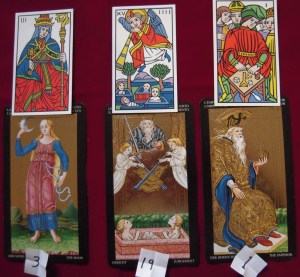 The toss from the bag got me 3 – 19 – 1. This time I shuffled Lo Scarabeo’s oversized gold foil Visconti-Sforza trumps, counted down to the 1st, 3rd and 19th cards and put them in their proper positions to make the first line. Then I drew cards with the corresponding numbers from Robert Place’s hand painted Budapest trumps. Dilemma! The Budapest trumps are not numbered the same as conventional decks. Do I pretend they have the same numbers as the TdM, or do I honor their historic reality and use the numbers printed on the cards? I could have gone either way. But when I saw that using the numbers on the cards would get me Judgment twice in the center, I decided that was the way to go. In this deck the Papesse is #3, ranked above the secular Empress.