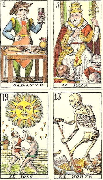 Some of the most beautiful Tarot decks I’ve ever seen emerged from nineteenth-century Piedmont. Giordano Berti has been producing limited editions of these precious but forgotten decks for several years. His most recent deck in the series is the Corband Tarocchi based on Carlo Della Rocca’s soprafino tarot. Della Rocca died in 1835, but enjoyed an afterlife later in the century when piemontese printers like Corband and the Avondo Brothers produced knock-offs of his beautifully engraved deck.