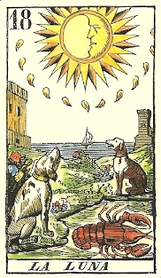 The facial expressions are priceless: Il Bagatto is anxiously wondering if he really needs that drink. The Pope seems angry and judgmental, and the Sun can’t believe what he’s seeing. Death is actually the de-clutter card. The loveliest card is the delicately colored Moon (shown below).