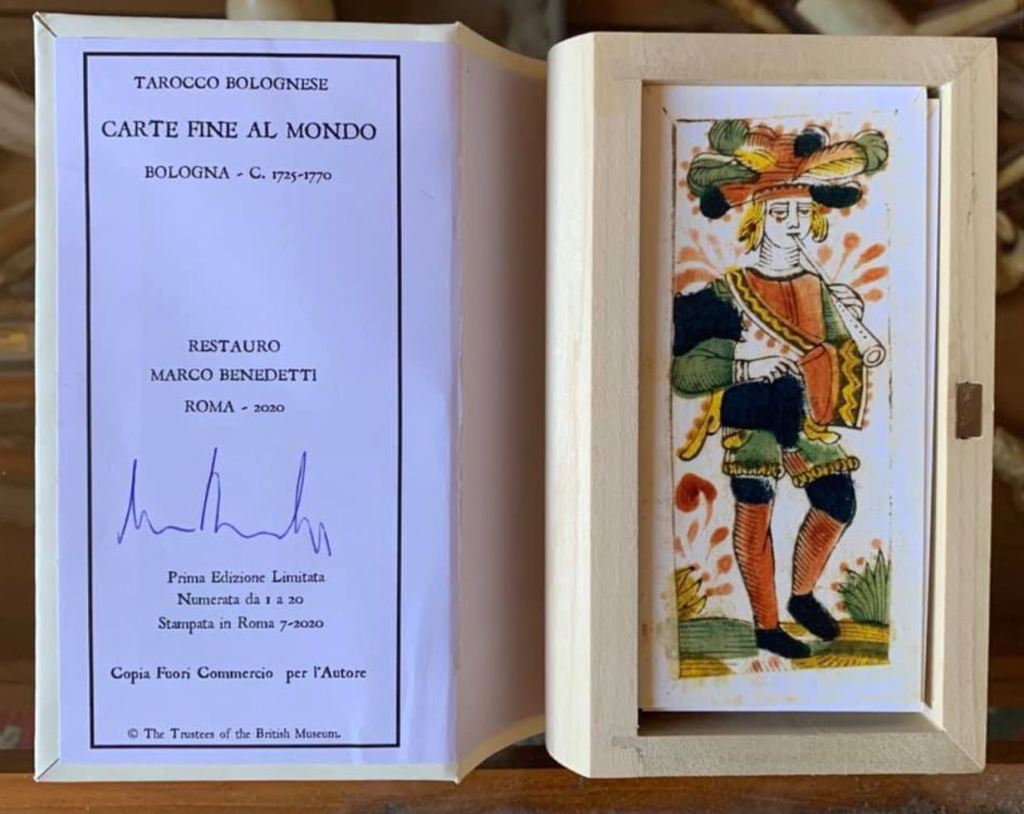 The Al Mondo Tarocchino is one of very few Bolognese-style decks to survive from earlier centuries with all cards intact. This deck comes to us from a narrow slice of time—after 1725 when Bolognese decks were required to have four Moors, and before the 1760s when double-headed figures became standard. The British Museum has the only copy of the Al Mondo deck in existence. Marco Cesare Benedetti has obtained the rights to reproduce twenty facsimiles. See deck details and purchasing information at the end.