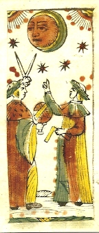 To understand just how special this deck is, we need some context. Bolognese tarot pre-dates the Tarot de Marseille by more than a century; and it may be the original tarot that was ubiquitous in northern and central Italy until the Tarot de Marseille flooded the market in the seventeenth century. The people of Bologna kept this deck very much alive and unchanged through the centuries by playing several different games with it. Below are three Bolognese Moon cards from the 15th, 18th and 20th centuries showing an enduring tradition that stretches back over 450 years. The Al Mondo card is in the middle.
