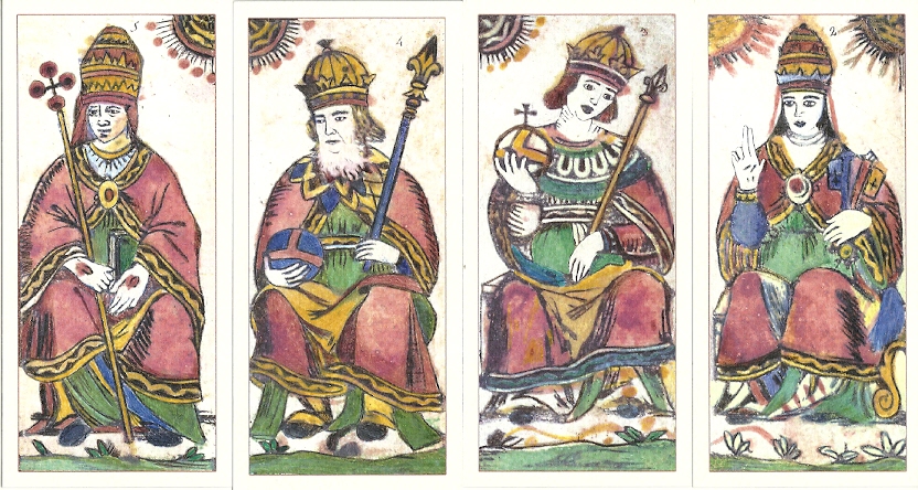 In early Bolognese decks, these four figures looked somewhat alike and were called the Four Papi (Popes) even though two of them were obviously secular rulers holding orbs and scepters; and some of them looked rather feminine. They were treated as a group and did not have numbers assigned to them.