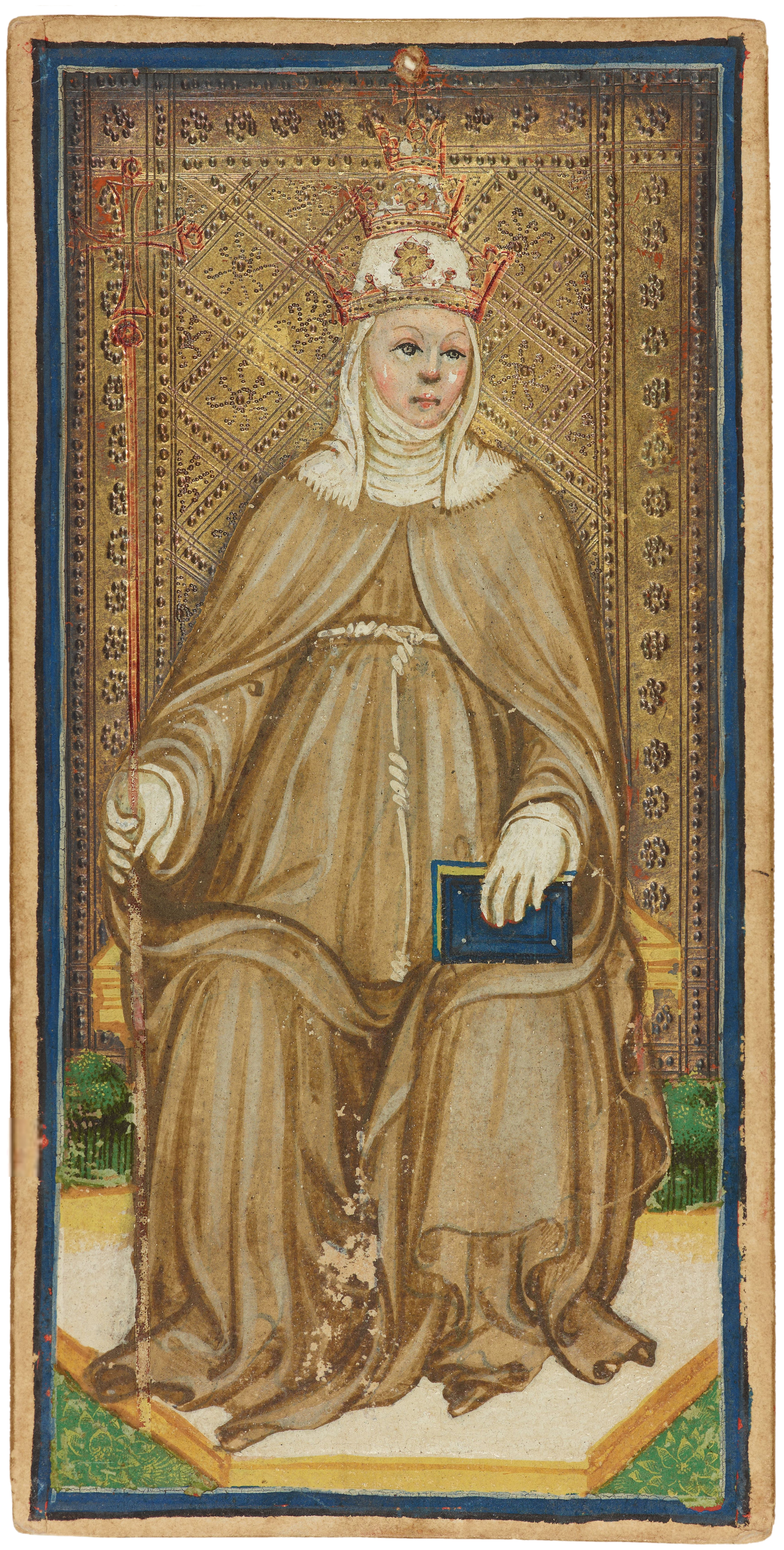 Until recently, it was assumed that Guglielma of Milan and Saint Agnes of Prague were sisters. Could the Visconti-Sforza card portray Guglielma’s supposed sister Agnes? The Duchess of Milan was likely aware of the cult of Guglielma, which still thrived in the vicinity of Milan in the 15th century. Her family had been supporters of the Umiliati for many years, and several Visconti men had served as directors of the order. Perhaps the Tarot card was the duchess’s way of referencing Guglielma and her cult while avoiding anything heretical. On the other hand, the duchess had a reputation for piety and had many friends in the Church, so this card may depict a Poor Clare spiritual advisor or friend and have nothing to do with the cult of Guglielma.