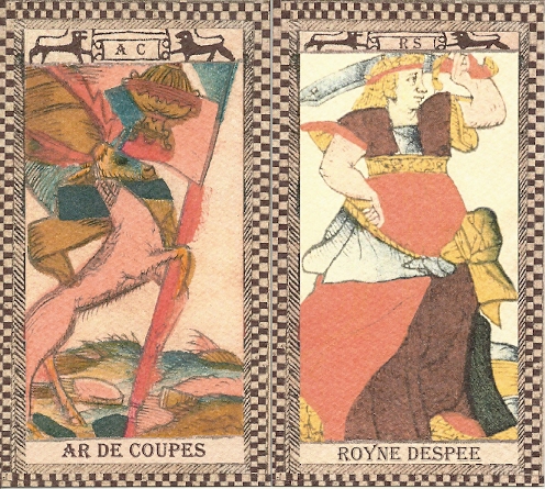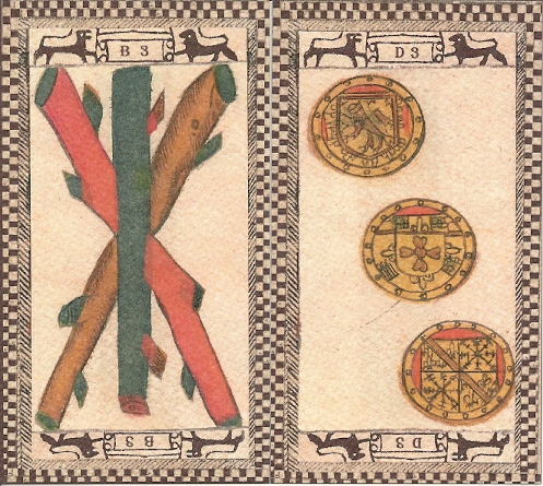 For some reason, the deck’s creator failed to put his name on it. The Two and Three of Cups have Faict a Paris Par (Made in Paris by) running up the left side. There’s room on the right side for the printer’s name, so its omission is mysterious. There’s evidence that he was making cards in Paris about 1650 at the same time as Jacques Vievil and Jean Noblet. It’s hard to imagine who, if anyone, actually used this deck. Since the cards display influences from several countries, perhaps the printer hoped to produce an international deck that would transcend borders and sweep throughout Europe. (Read more about this in the Comments below.)