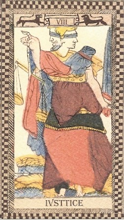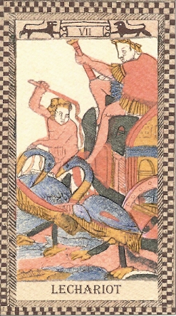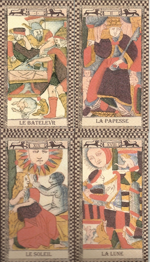 The bilingual book (Italian and English) that accompanies the deck is the result of two years’ research by the authors, Morena Poltronieri and Ernesto Fazioli. They cleared up my confusion over some of the jumbled images in the facsimile, especially La Foudre, Temperance and Sun. But I was left with several questions. Why are geese or swan pulling the chariot? Why two faces – a woman and a bearded man – on the figure of Justice? I’m not satisfied with their explanation that it’s Athena being born from Zeus’s head. They misread the sphinx at the Emperor’s feet as a dog, making their interpretation of this card totally irrelevant. I wonder why the names of some cards are badly misspelled or broken in strange places: Lan Pereut, Ler Mite, A Trempance, Les Toilles. Surely the printer knew better. Is it some kind of code?