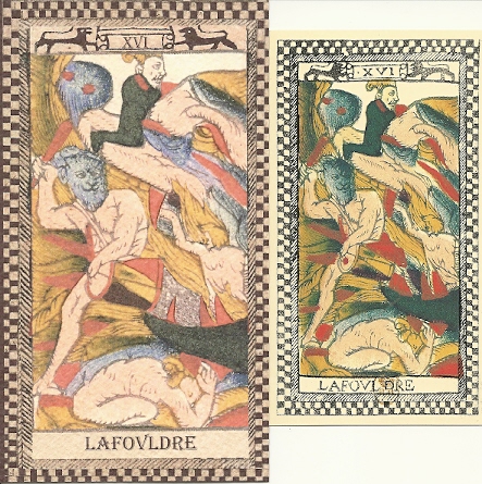 At left is La Foudre, the card I had the hardest time understanding. This card is traditionally a lightning-struck tower or tree; but in this deck it’s a Hell mouth, shown here in the 1984 Grimaud facsimile and the larger Museo dei Tarocchi restoration. In the newer deck, the images have been enhanced, although in some cards the image has been very slightly clipped along the edge. The borders and the cartouche at top center have been standardized in all the cards; but unless you compare the two decks closely, you probably won’t notice these differences.