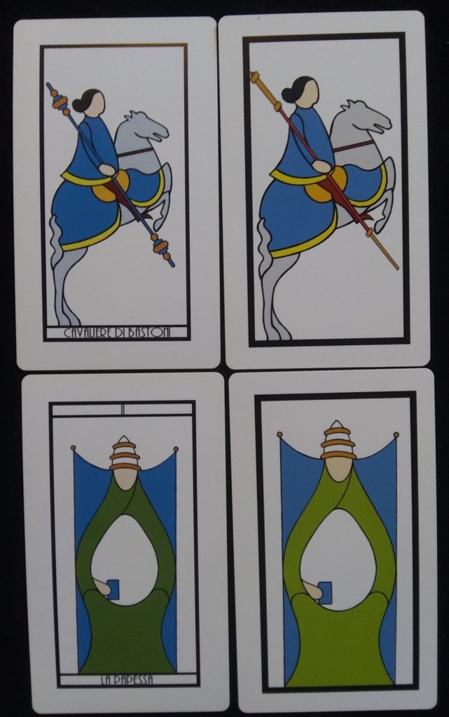 The most stunning deck in my collection is the updated Visconti Homage deck in gold and silver foil. Here’s a photo of the original and the updated versions in both sizes. Thanks to the heavier black border and the absence of numbers and titles, these sleek cards make a strong visual impact. Your name is inscribed on the Two of Cups and the inside of the wooden box.