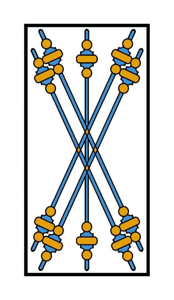 In the original deck, several trump cards are very TdM-ish: Strength, Devil, Tower, Star, Moon, and Sun. If you order the original deck from Gamecrafter, you get these six cards from the later version of the deck in addition to the original TdM cards, for a total of 84 cards. If you order the 25th anniversary deck, you get the TdM-type cards listed above plus six cards in Bolognese style: Emperor, Strength, Death, Star, Moon and Sun. Ninety cards in all, allowing you to switch them out and customize your deck.