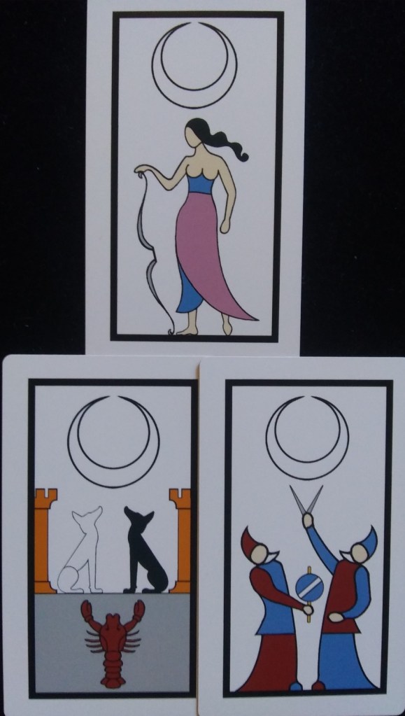 Shown here are the three Moon cards: TdM-style with dogs and crayfish, the Bolognese astronomers, and Benedetti’s rendition of the Moon as Artemis.