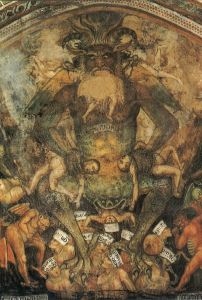 Satan chomping on sinners was a popular image in the late-medieval/early-renaissance period, usually in the context of a Last Judgment fresco designed to terrify believers into obedience. Here’s a fresco by Taddeo di Bartolo done in 1391 in San Gimignano. This image was lifted from Tarotwheel.net, which has a wonderful page on the history of the Devil card, with lots of gruesome imagery (link below).