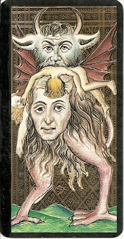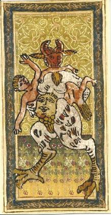A very similar Devil is found on one of the Rothschild sheets, two uncut sheets of twelve trump cards printed about 1500. Many of the Rothschild cards are nearly identical to standard Bolognese cards. But the Bolognese Devil is rather different—in profile and not eating anyone. Lo Scarabeo used the Rothschild Devil in two of their Visconti-Sforza reproductions: Their smallest version which is still in print, and a gold leaf deck printed about twenty years ago.