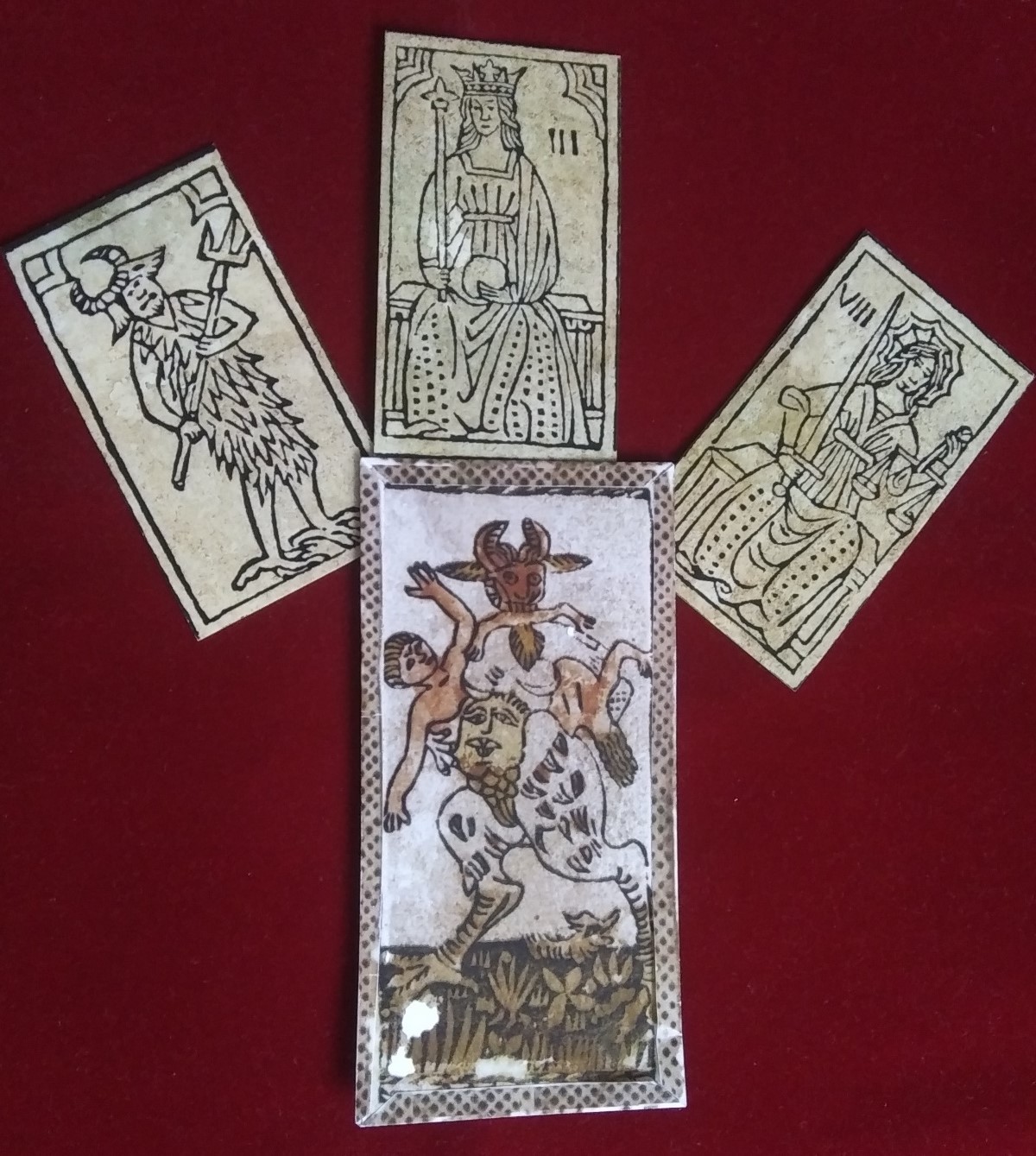 Marco Benedetti printed a special Devil card for me with the edges of the back paper folded over to the front and glued down to make the border, just as they did centuries ago. I gazed at the card for a while and asked, “What can you tell me?” The Devil replied, “I’ll tell you what’s eating you.” So, I designed a spread to give me that information.