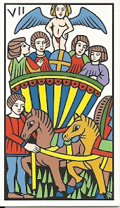 I first encountered the Budapest deck in the Los Angeles Folk Art Museum where Robert Place curated a tarot exhibit in 2010. Place’s cards are drawn with smooth heavy lines, then filled in with luminous color. Place took some minor liberties with the original cards, but the clarity of the images is superb. The Chariot was partly sliced off on the original sheet and had to be recreated. Place’s Chariot is unique in having the horses face the same direction with a servant holding the bridle.