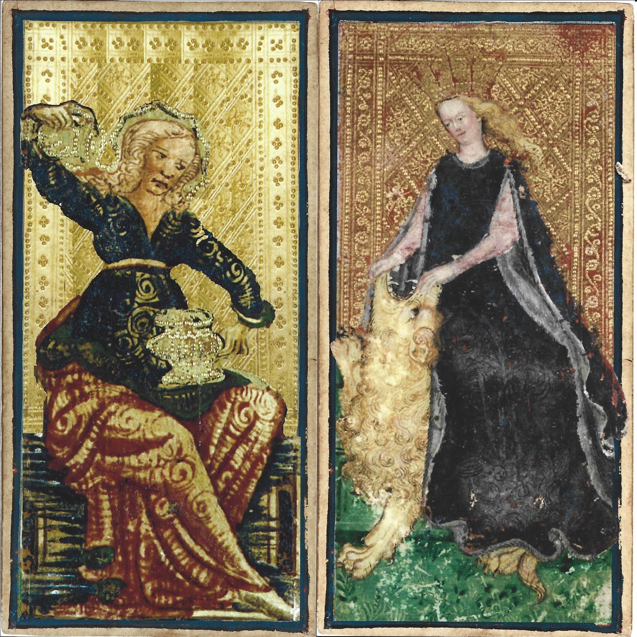 The original Temperance card is one of three cards painted about 1475 that show a woman standing in a blue gown sprinkled with gold stars holding a symbolic item. This card has been replaced by the Temperance card from the Ercole d’Este deck that was hand painted in mid fifteenth-century Florence or Ferrara (now located in Yale University). I’m very happy to see the original Strength card, showing a man who seems to be clubbing a lion, replaced by the woman and lion from the Visconti di Modrone (Cary Yale) deck, painted by the Bembo workshop about 1442.