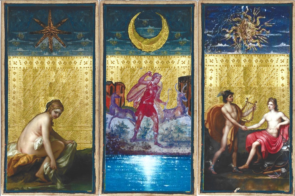 The Star, Moon, Sun series from 1475 includes two more standing female figures in blue gowns, plus the Sun card as the mask of Helios held by a putto skateboarding across the sky. Benedetti wanted to associate this series with Venus, Diana and Apollo, so he surveyed art history looking for appropriate examples. The Star card is from the painting A Nymph at her Bath by Charles-Andre Van Loo in the first half of the 18th century, while the Sun is from Apollo and Hermes by Pierre Narcise Guerin in the early 19th century. The Moon figure is taken from a wall fresco in Pompeii and the background is collaged from the Moon card in the Visconti di Modrone deck.