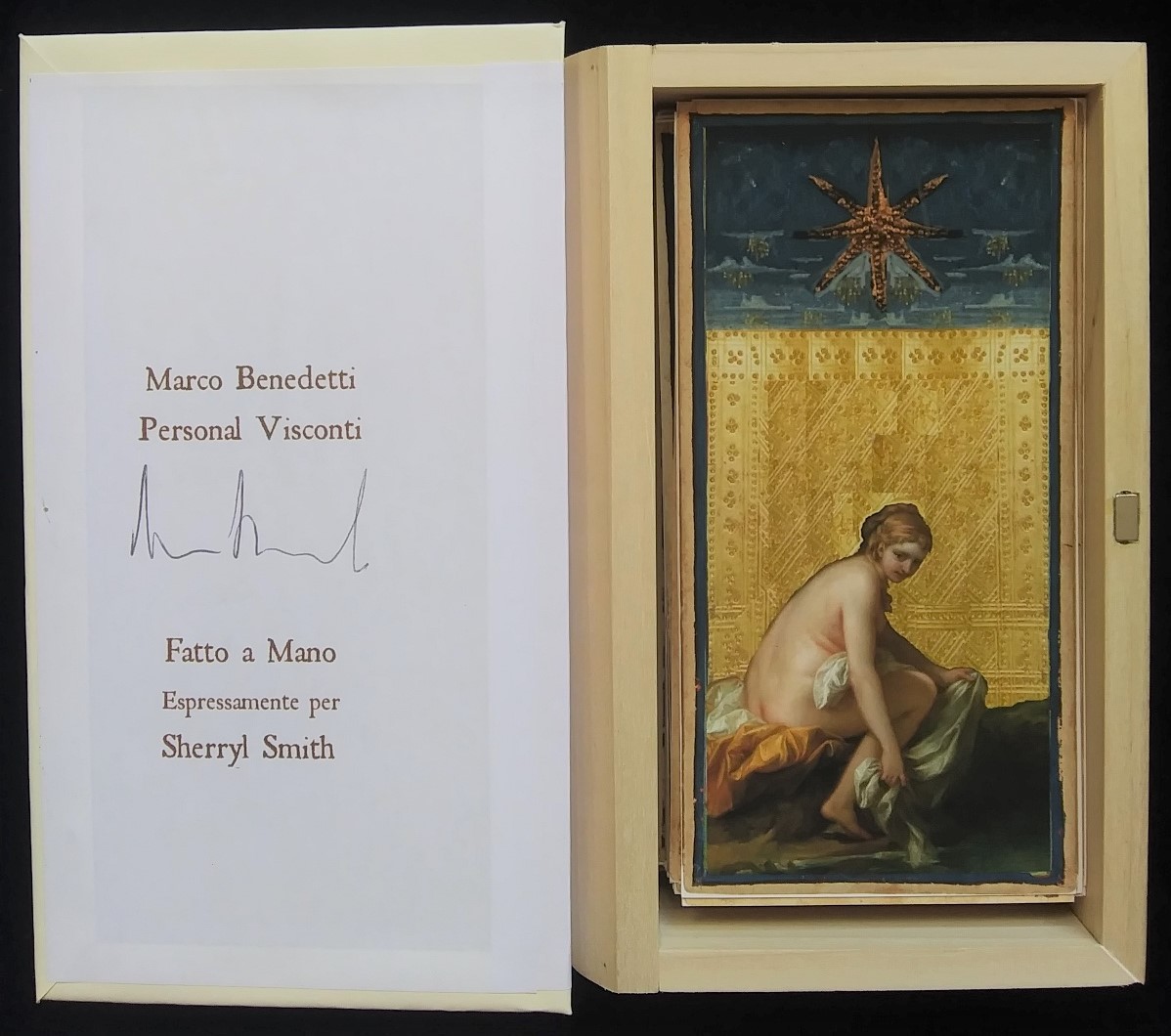 Benedetti has had a long and intense relationship with the Visconti-Sforza, dating from 1975 when he purchased his first deck. In 1996, he created his elegant and minimalist homage to the Visconti-Sforza in tempera on gold leaf for an art exhibit. He currently prints this deck on demand in gold and silver foil. The Personal Visconti deck described here is a beautiful testament to his life-long love for the Visconti-Sforza deck.