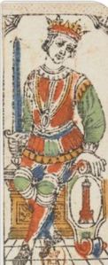 The museum owns a single card, the King of Swords, from another Dalla Tore deck. This card is the source for the backs of Benedetti’s cards, and it has clarified the correct name of the deck. The backs of the nearly complete deck of 57 cards are oriented horizontally and have a rather unbalanced design of two cupids and a tree. Benedetti prefers the elegant Artemis with bow and arrow on the back of the King of Swords. This image is oriented vertically, which you expect in a playing card.