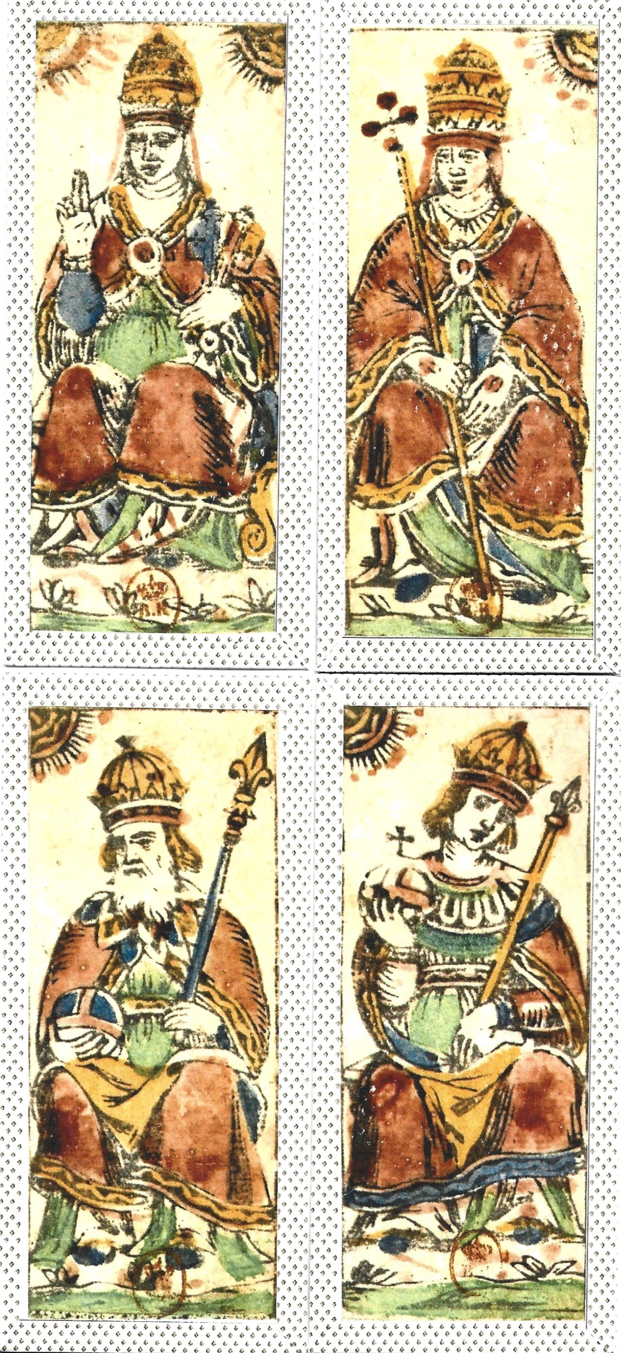 Bolognese tarot has an unbroken lineage of trump cards that has remained unchanged for five centuries. One exception is the four Papi: The Emperor, Empress, Popess and Pope. In 1725, the Church ordered the card makers of Bologna to replace these figures with four Moors. Then a few decades later, all Bolognese cards became double-headed. The Dalla Tore is the only existing deck that predates 1725 and shows us what these four cards looked like before the change. The Emperor and Empress are easy to recognize; but the Pope and Popess both seem quite feminine and there is some debate about which one is the Pope.