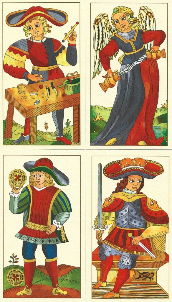I want start 2024 by showing off the happiest tarot decks in my collection. Let’s face it, some of the people in our pre-20th century decks can be rather grumpy, if not downright mean looking. I must have at least 100 facsimiles of historic decks (I haven’t actually counted them), but I could only find a handful of decks where the figures had consistently pleasant faces. The characters in the decks discussed below look friendly and optimistic, and seem to actually enjoy life. I wouldn’t hesitate to start up a conversation with any of them.