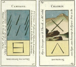 It wasn’t until 1791, the last year of his life and two years after publishing his tarot deck, that Etteilla produced a deck based on the system set out in his 1770 book. A few months later, he issued his last publication, Etteilla, ou l’art de lire dan les cartes (Etteilla: Or the Art of Card Reading) a final summary of his career and his teachings, making this one of the first deck and book sets.