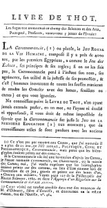 Etteilla’s greatest contribution to esoteric tarot was his four-volume work on the Book of Thoth, and its companion deck published a few years later (the first book and deck set). The book, Manière de se récréer avec le jeu de cartes nommées tarots (A Way of Entertaining Yourself with the Deck of Cards Called Tarot) was issued in four volumes from 1783 to 1785. The title is nearly identical to his cartomancy book published over a decade earlier. It seems like a rather flippant title for a work that transmits ancient spiritual wisdom. But in Etteilla’s day, books needed a stamp of approval from the royal censor before they could be published. Etteilla’s first book on tarot had been rejected by the censor a few years earlier. Perhaps this title was an attempt to make his tarot book seem like a frivolous work on fortunetelling that wouldn’t attract the censor’s attention.