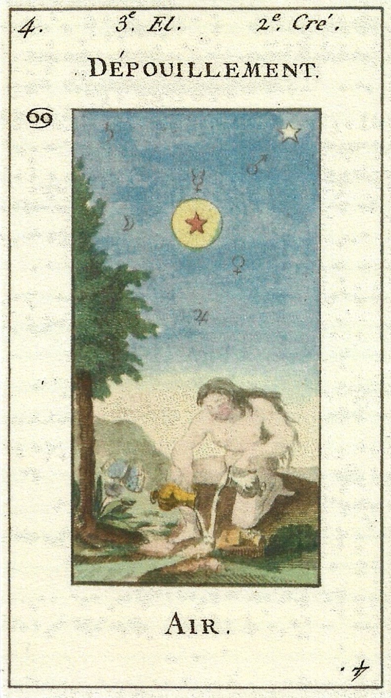 The first twelve trump cards contain an overlapping array of symbols: The seven days of creation, the four cardinal virtues, twelve zodiac signs, four elements, and divinatory keywords. For example: Card number 4 in the sequence represents the second day of creation, the element Air, and the zodiac sign Cancer. Its keyword is “Depouillement” (being stripped bare, or shedding one’s clothes). The image is nearly identical to the TdM Star card.