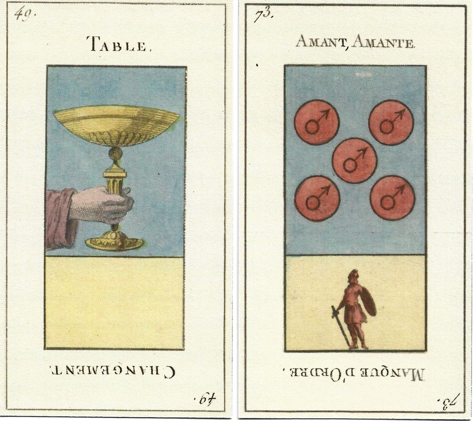 The deck was accompanied by a four-page leaflet, making this the first deck with an LWB (Little White Book). Unfortunately, this leaflet is the first in a long line of totally unhelpful LWBs that do little to illuminate their associated deck. Etteilla was criticized for his poor writing style, with good reason. His vocabulary is basic, but the resulting word salad is nearly indecipherable. In the booklet, he seems to be justifying divination as a route to wisdom and a connection to the divine. Then he gives a sample reading using this line of cards: